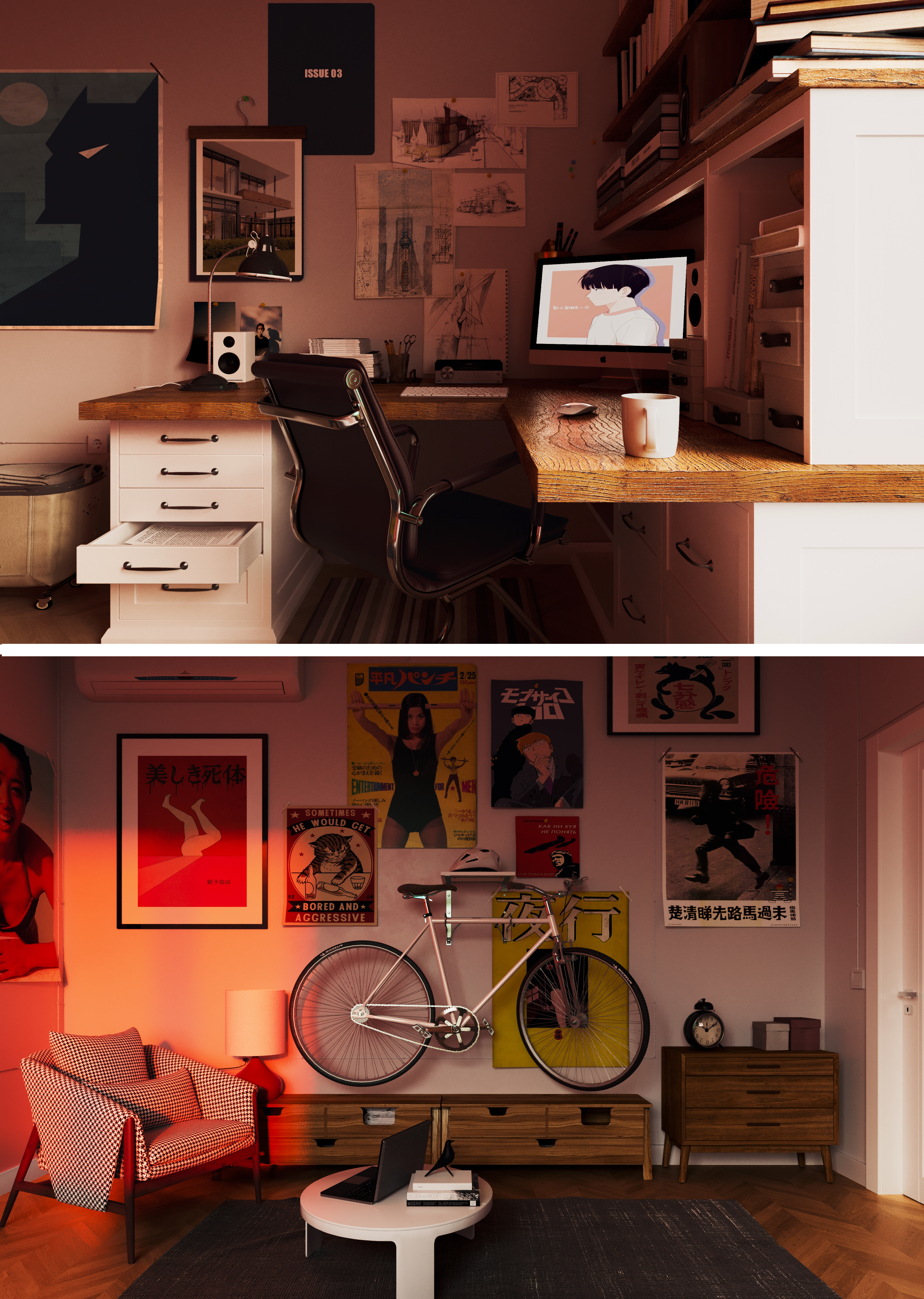 Кто же этот незнакомый персонаж, обитающий в этои комнате. Молодои и студент архитектурного, будущий победитель арх конкурсов, пока что снимающий комнату вместе с ребятами с курса. Он нашел на авитуо старую дорогую мебель и отреставрировал ее. Хотя я посмотрел на авито, и понимаю что нет. Это просто нелепый мажор купивший себе в съемную комнату пару дорогих кресел. Плюс у него и аимак и макбук(тоже с алика). Возможно это просто богатый манга-художник. Я с такими не знаком, возможно вот так они и живут. В царстве шума (открой ФУЛЛсайз), теснясь среди моделей дорогой мебели. При этом нисколько не думая о дорогой мебели. Ведь им важнее Атмосфера.