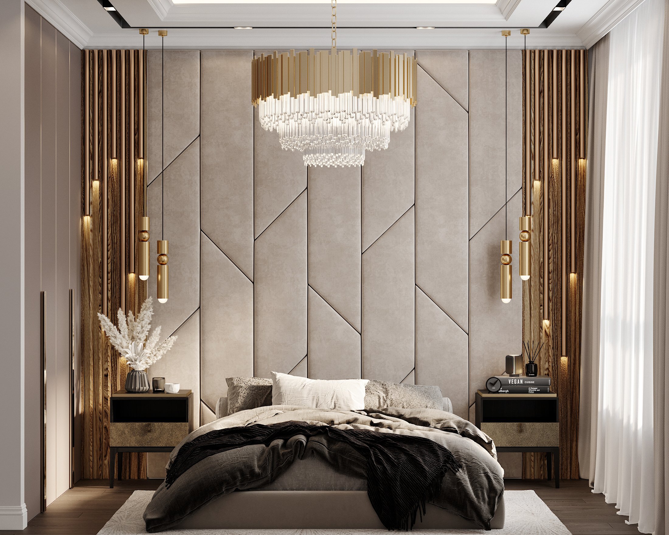 единственное что не попадает в стиль это постельное белье и тумбочки прикроватные бы чуть интересней материал настроить.