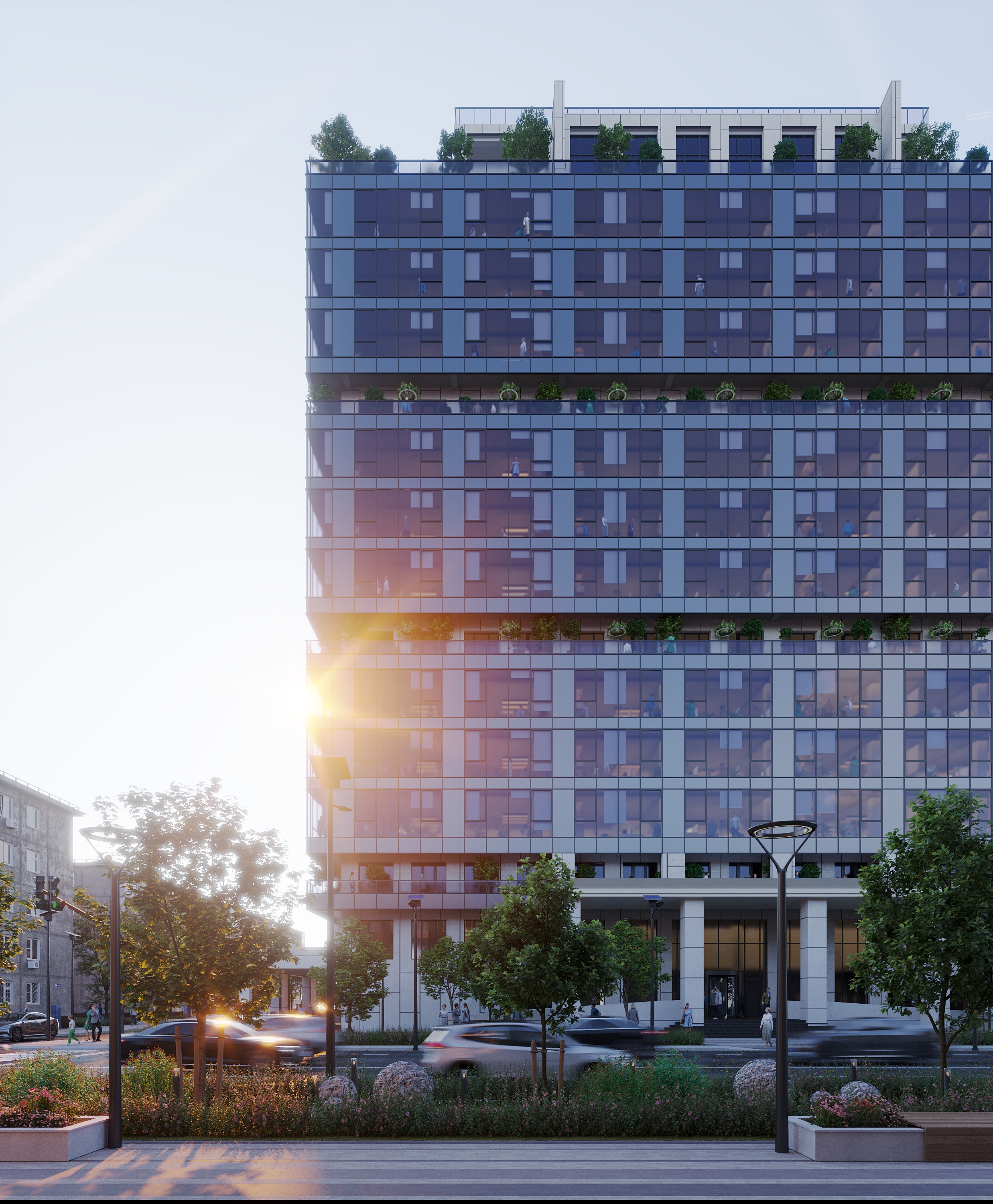 A modern office building designed with efficiency, transparency, and sustainability at its core.