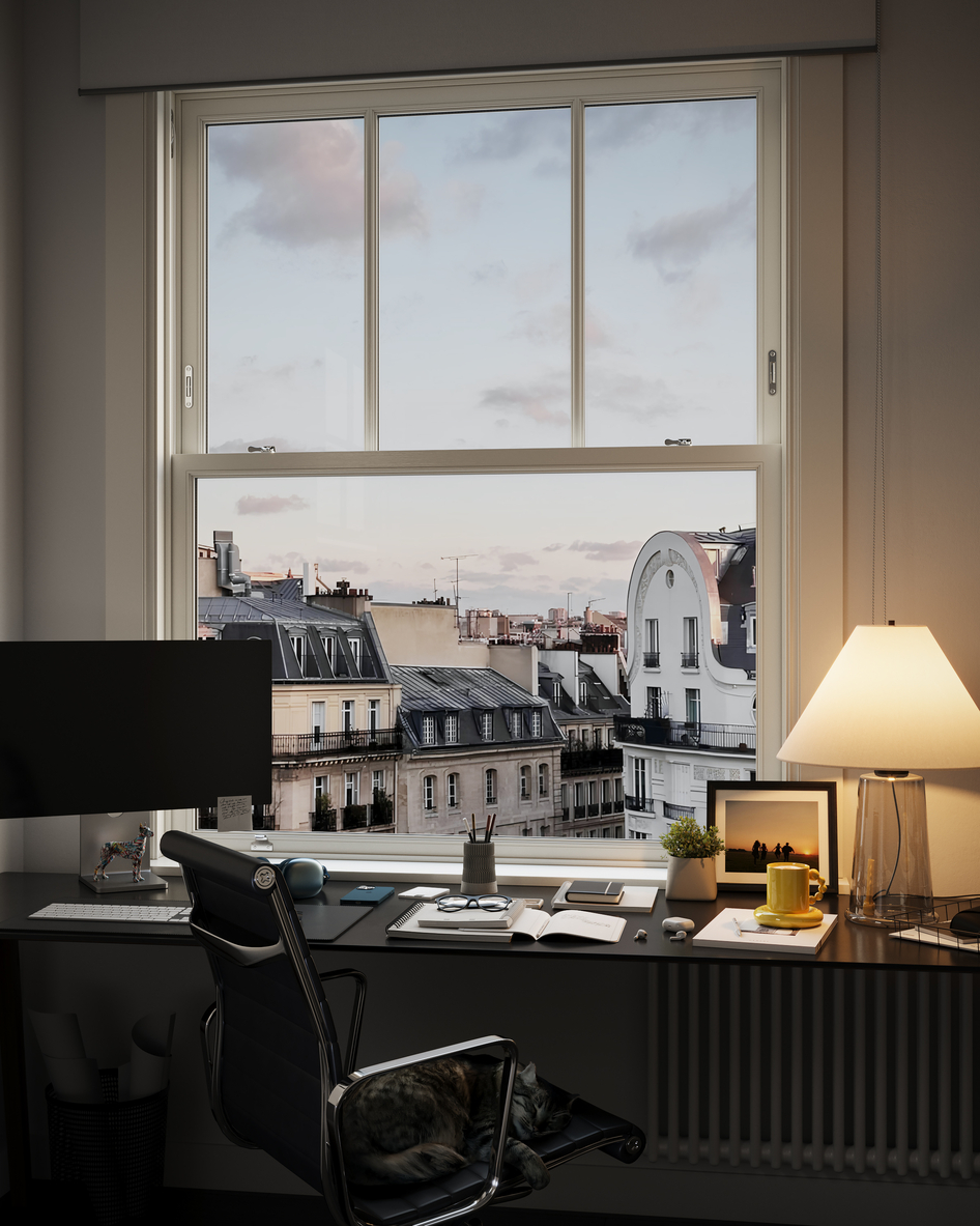 A workspace designed for both productivity and comfort. The soft glow of the lamp blends with natural daylight, creating a warm and inviting atmosphere. Architectural elements, rich textures, and carefully curated details bring life to the space, making it not just functional, but truly inspiring