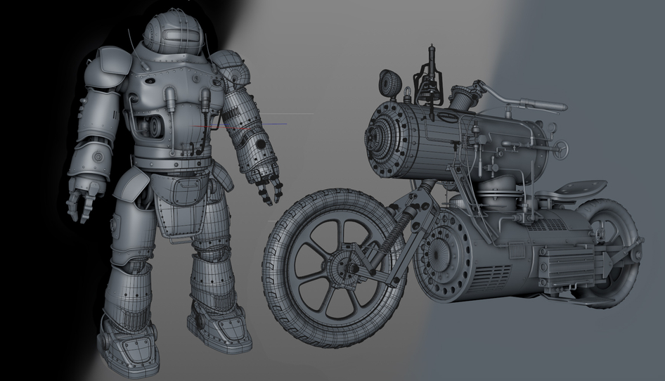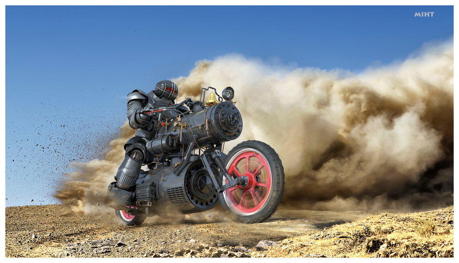 очень круто конечно, но статично, нед движа в картинке мне кажется. Блюр на спицах нарисован, нипель стоит на месте, деталь около переднего колеса могла бы ходить как у локомотива, весь объект мог бы подразмываться от движения слегка, линии размытия ламп могли бы подчеркнуть скорость... еще в догонку материал всего в сцене по ходу один и тот же, не хватает деталей в материалах, фара не светит, нет деталей света.. колокол мог бы болтаться, клубы пара вываливали бы из фарсунок каких-нибудь и из трубы от парового котла, кадр задрать передним колесом можно повыше, что бы динамика чувствовалась в композиции... прост уже вижу как можно было бы крутянско это сделать, чтоб ваще огонь был... веньетирование замутить, киношные блики... доработай плиз, будет авард стопроцентно...
