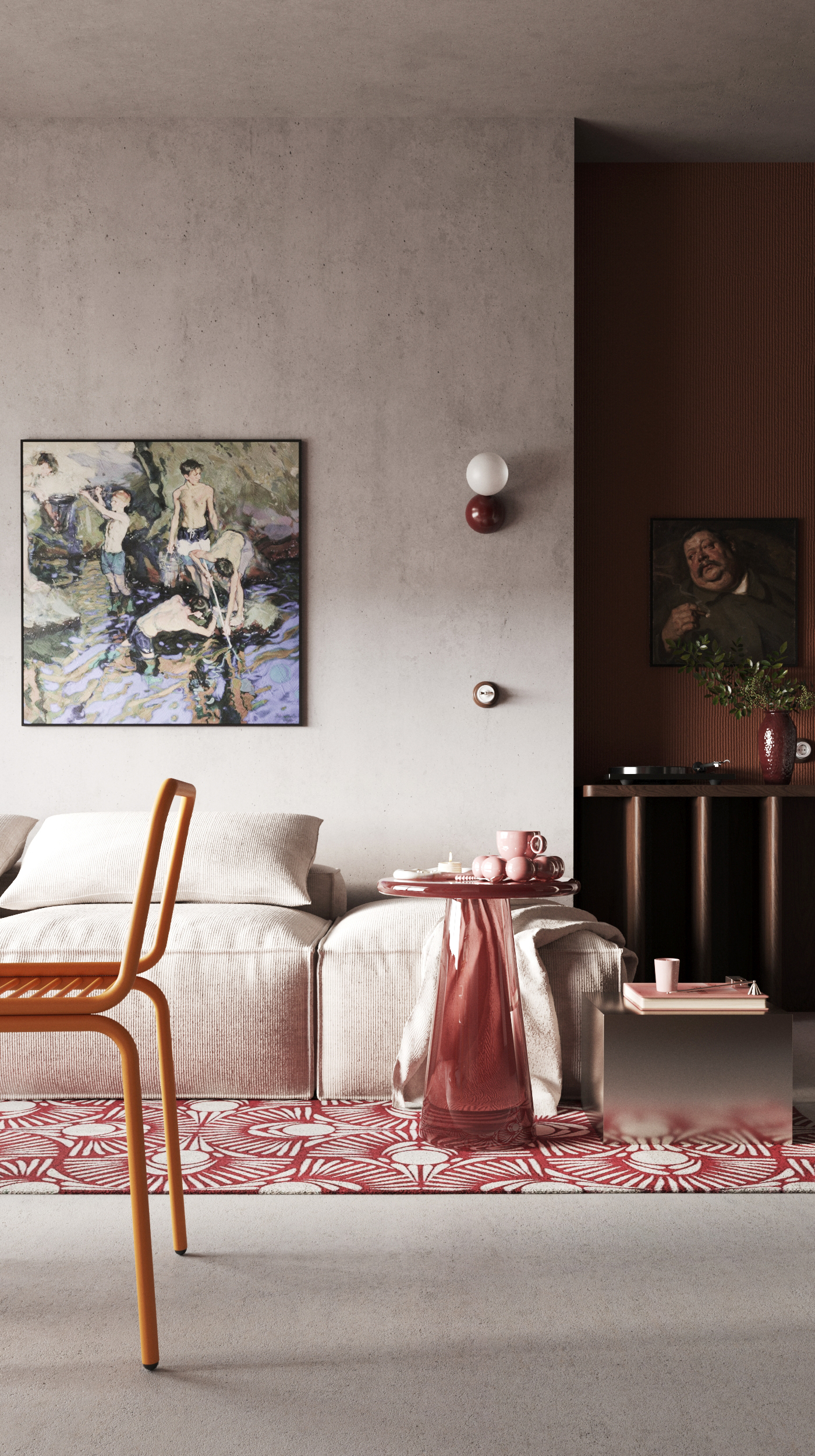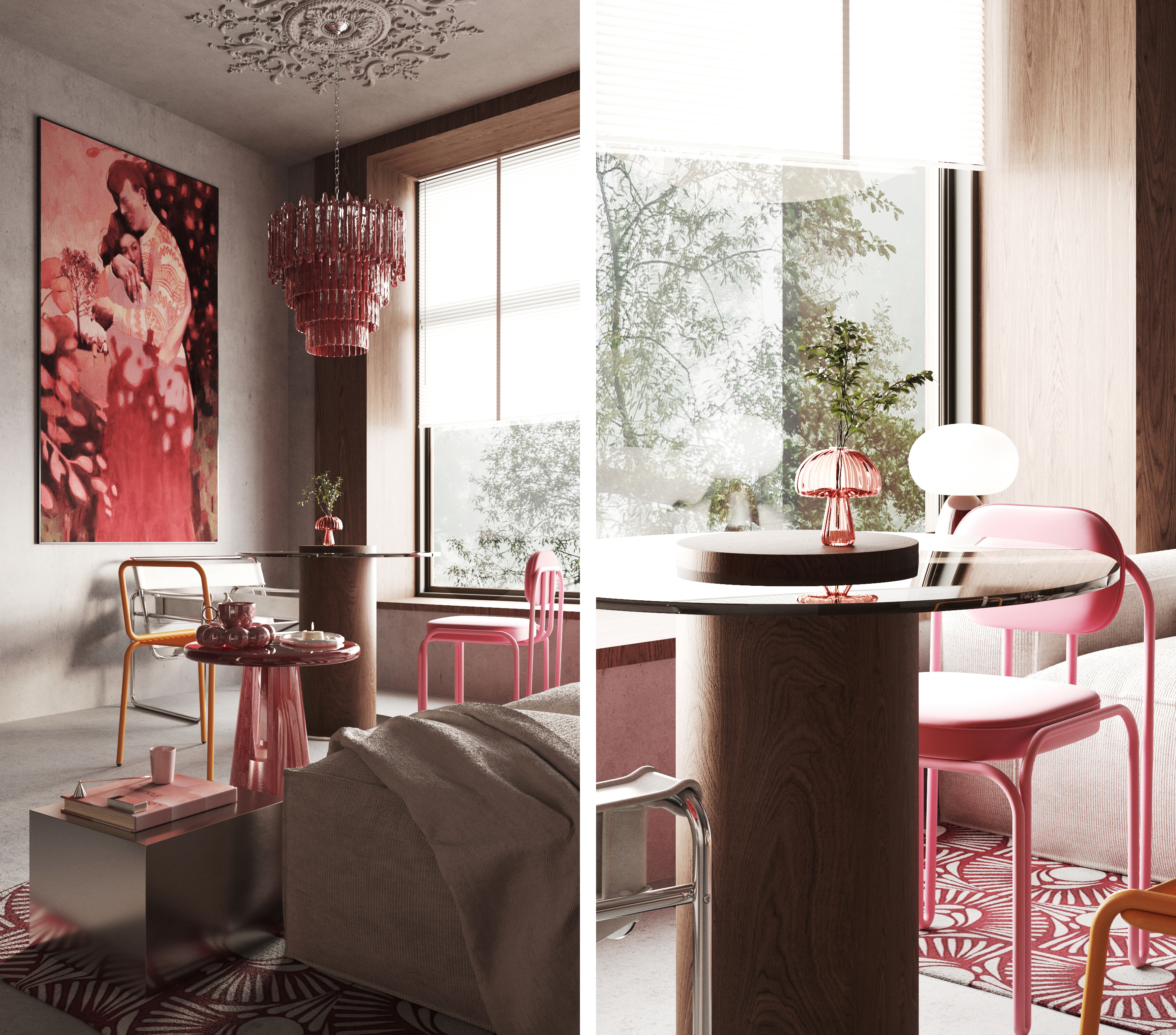 Работа создавалась не с целью стать точной копией оригинального автора, а для отработки навыков в настройке материалов, схем освещения, постановки ракурсов, а также развить общую насмотренность в создании интерьеров с яркими акцентами.