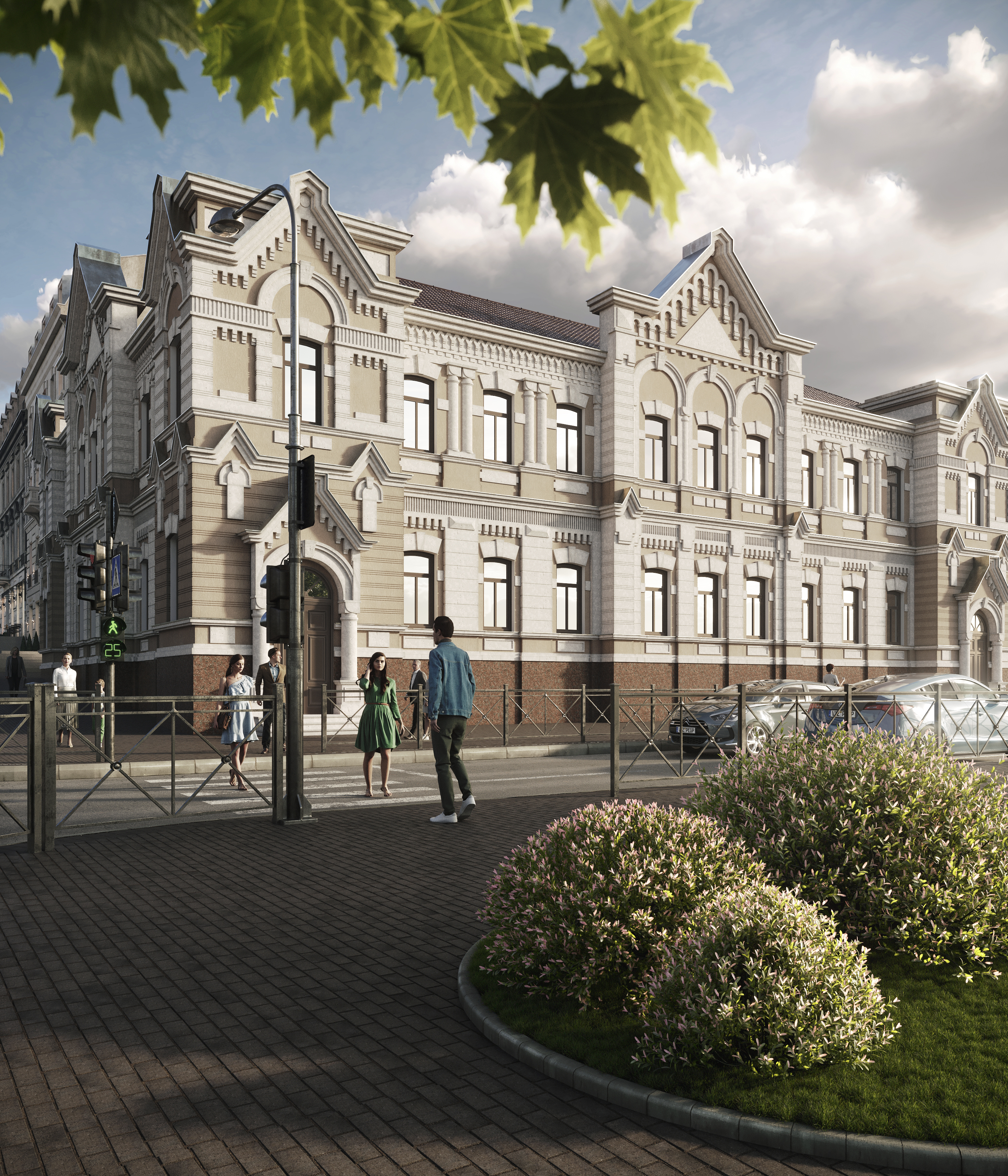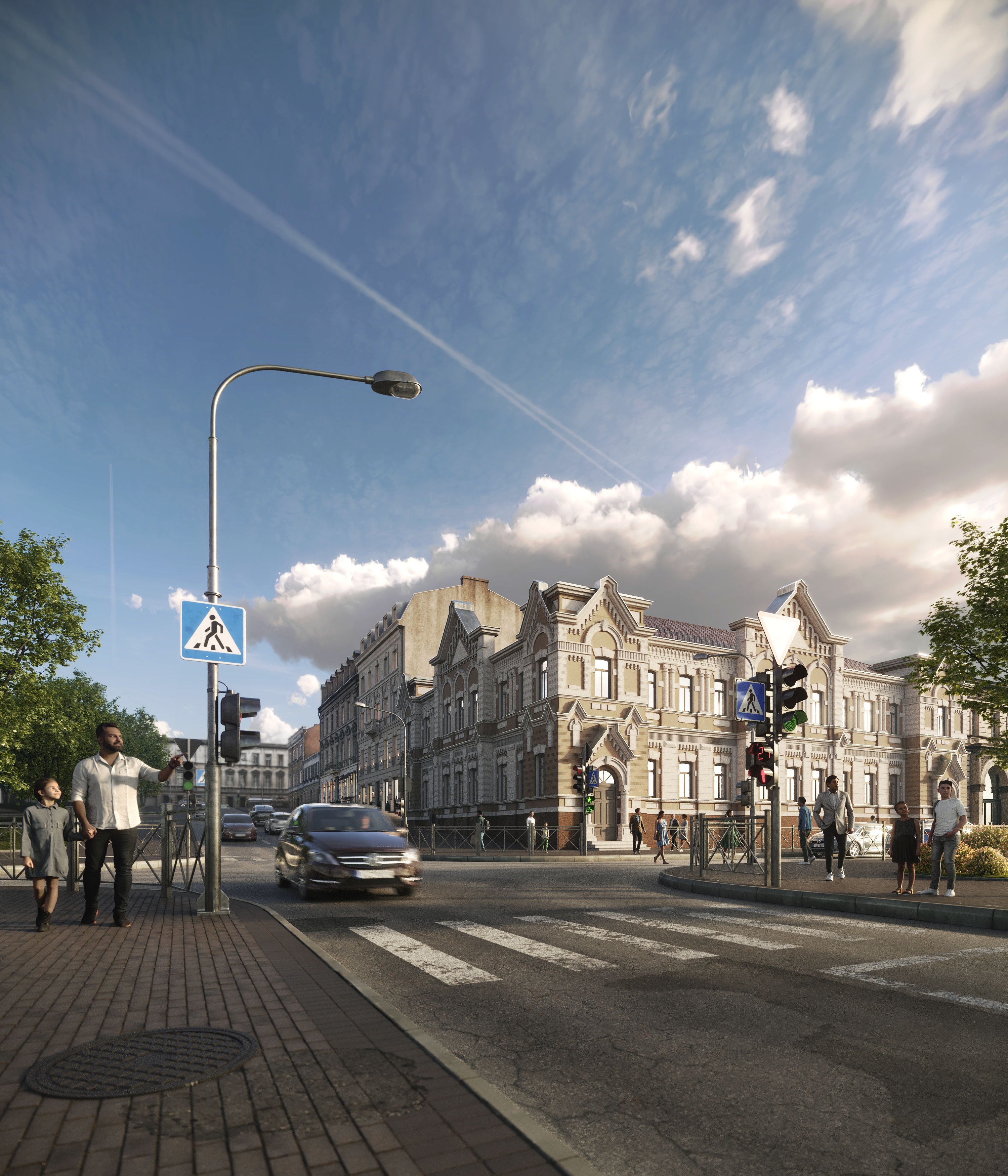 Композиционно стоят некомфортно. Что-то как будто обрезано, или перспектива не та. Люди как будто несомаштабные, или как-то так стоят (например рядом с низким светофором). На втором фонарь ровно по центру закрывает фасад, и лист сверху огромный. (сдвинуть фонарь и листья поменьше). На первой смотрю на "негра", куда он ведет девочку? Зачем там огромный люк? Эти все сюжеты тут не нужны. И так про дом уже не вспоминаешь. На третьей верх дома упирается ровно в край кадра, если оставить часть неба над ним, будет сильно лучше
