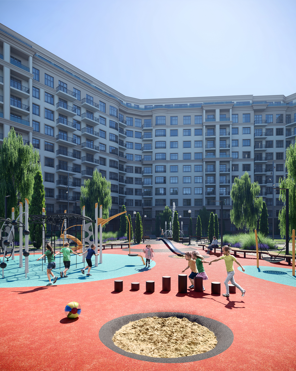 песок явно не проработан для переднего плана смотрится вырезанным и приклеенным, я бы его обрезал, чтоб остались только дети впереди, так и внимания на архитектуру больше будет, а то сейчас смотришь на картинку и самое контрастное и яркое пятно впереди и ничего кроме него не видишь, а это пятно явно проигрывает по проработке