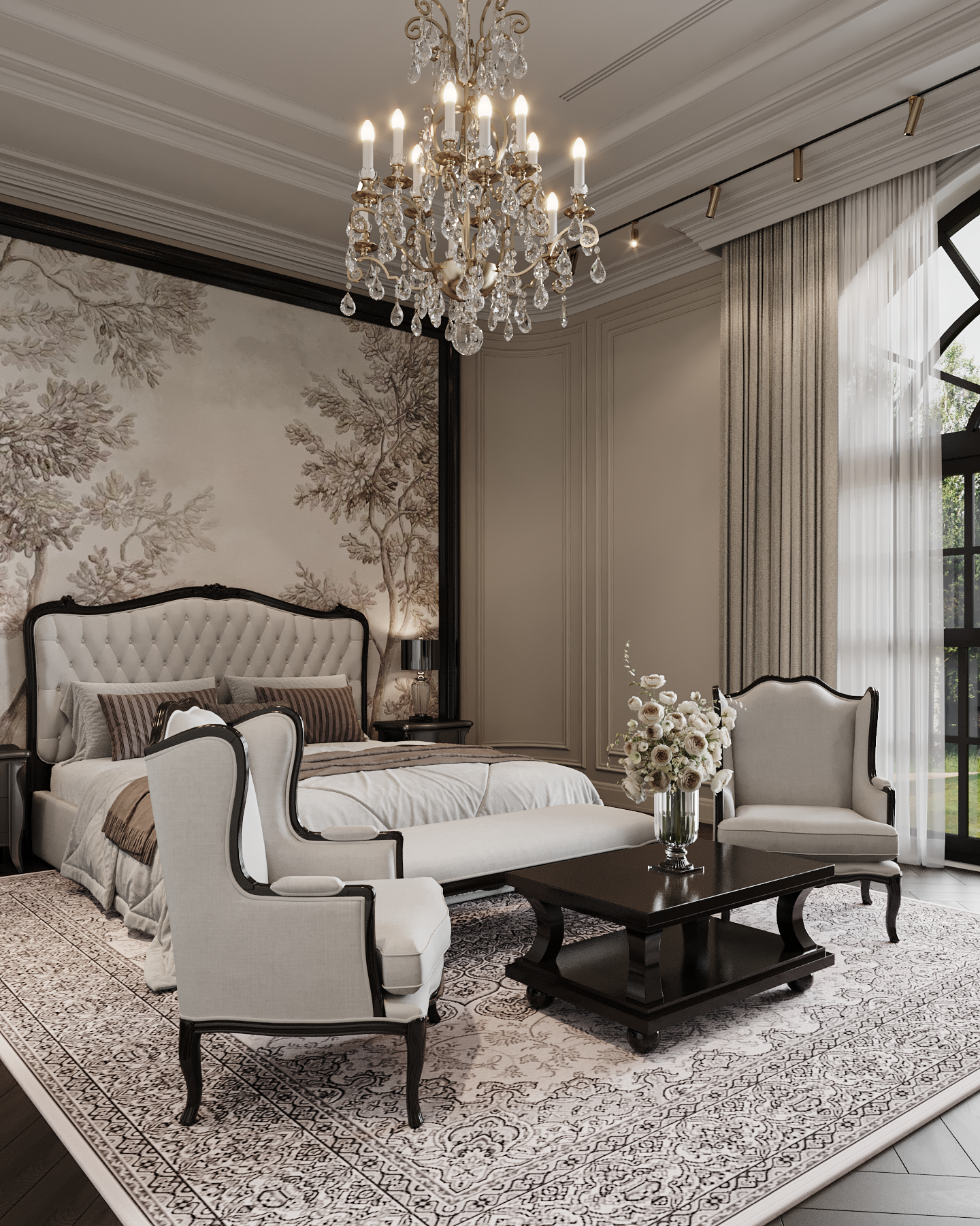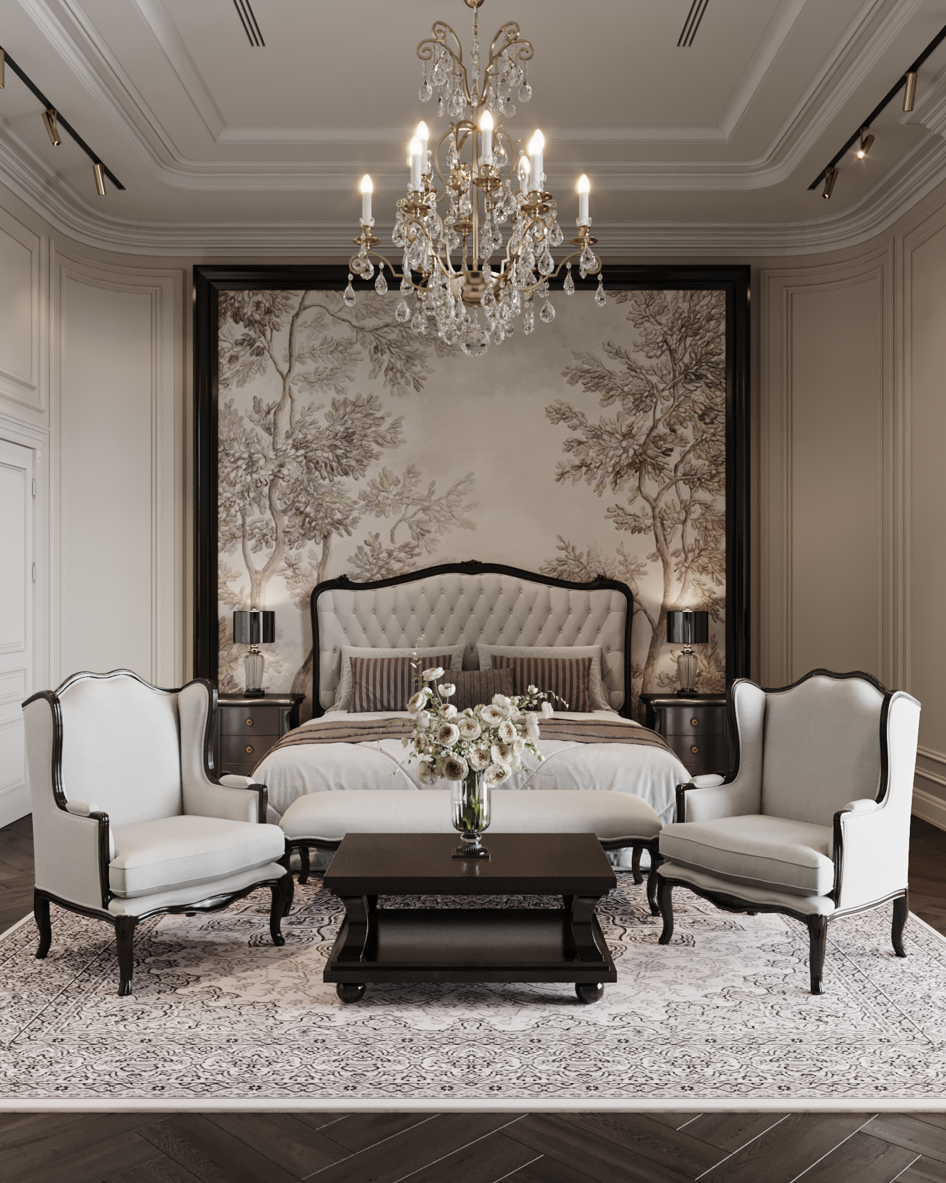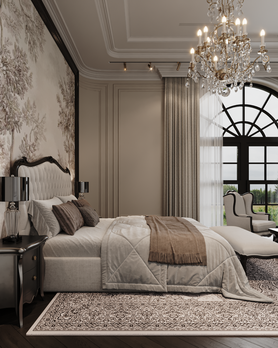 Для референса я выбрал неоклассический интерьер спальни и постарался максимально приблизиться к оригиналу. Референс: