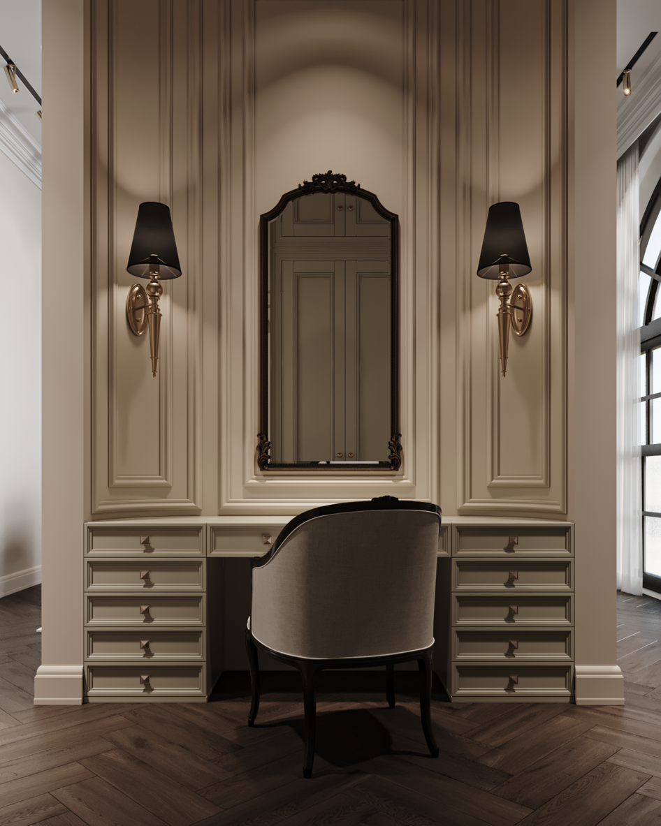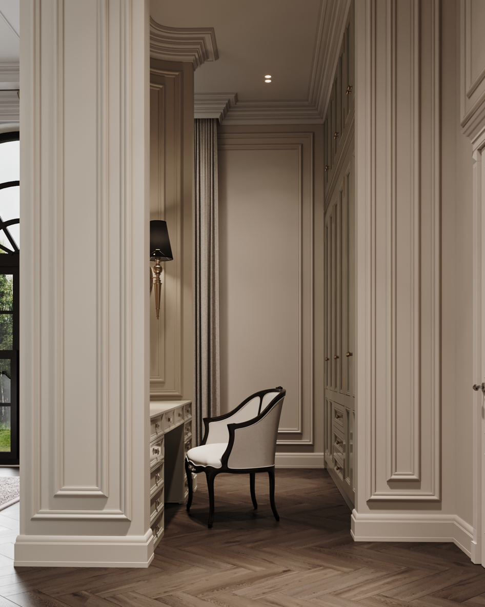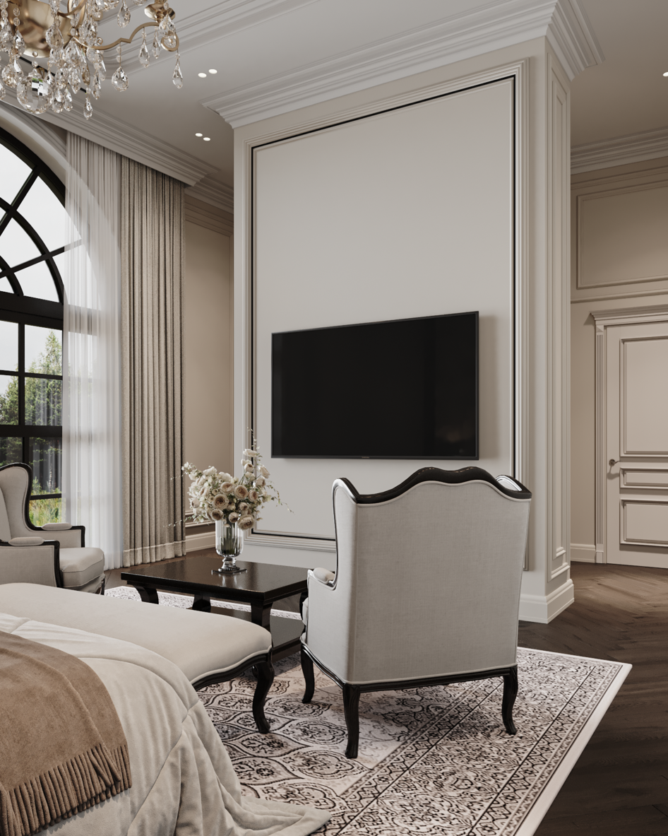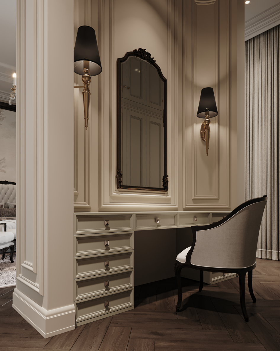 Для референса я выбрал неоклассический интерьер спальни и постарался максимально приблизиться к оригиналу. Референс: