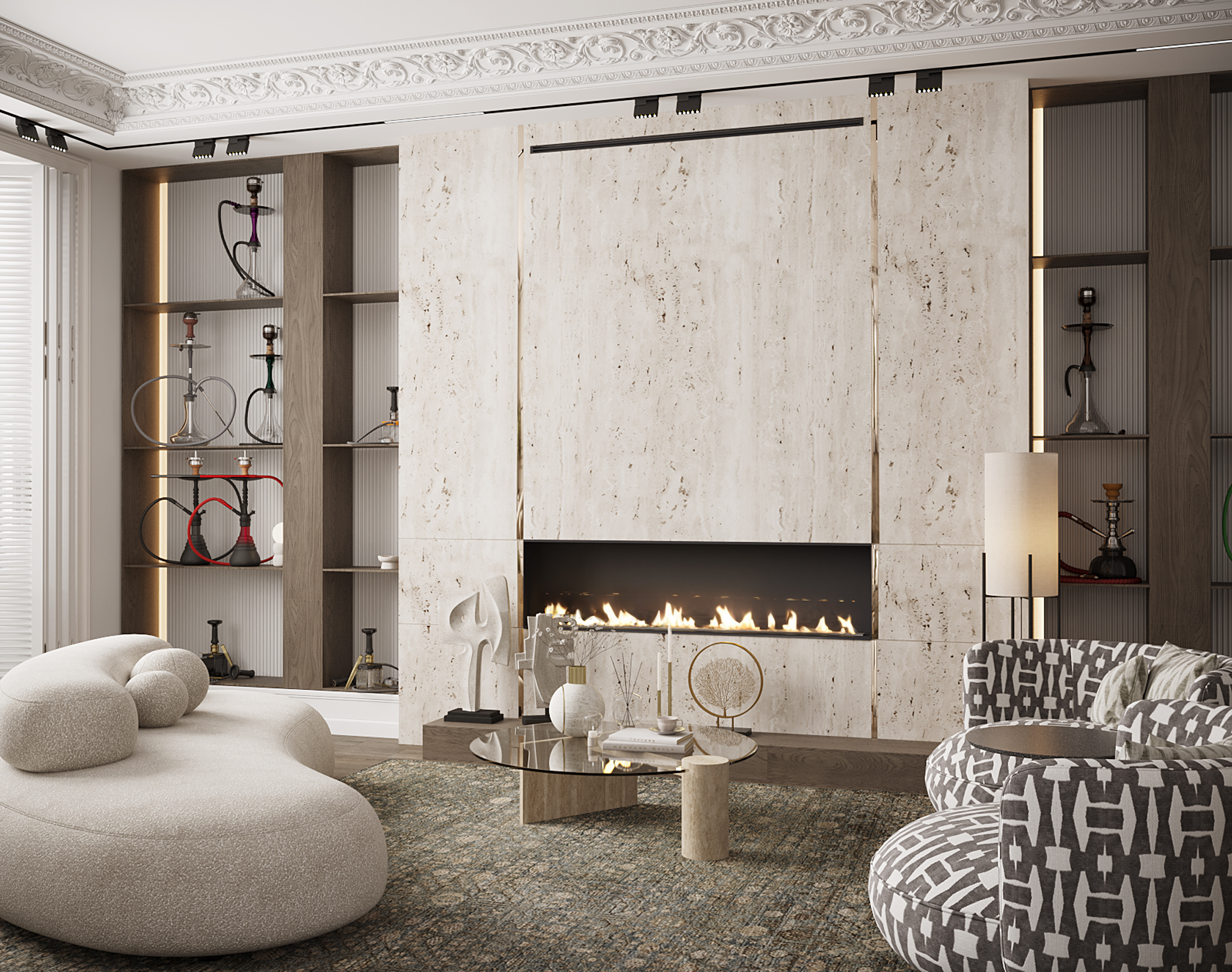 хозяева много курят, но хотели белую спальню с комнатой где они будут курить(ну вот так вот), дверки в спальню сделаем со стеклом, что б дым не шел в спальню, а кальяны на полке...ну не книги же мне им ставить...сейчас библиотеки это редкость, темболее у них есть еще два кабинета, каминная на 1 этаже..На полки что то тематическое поставить, пусть кальяны собирают. вытяжка над камином предусмотрена.