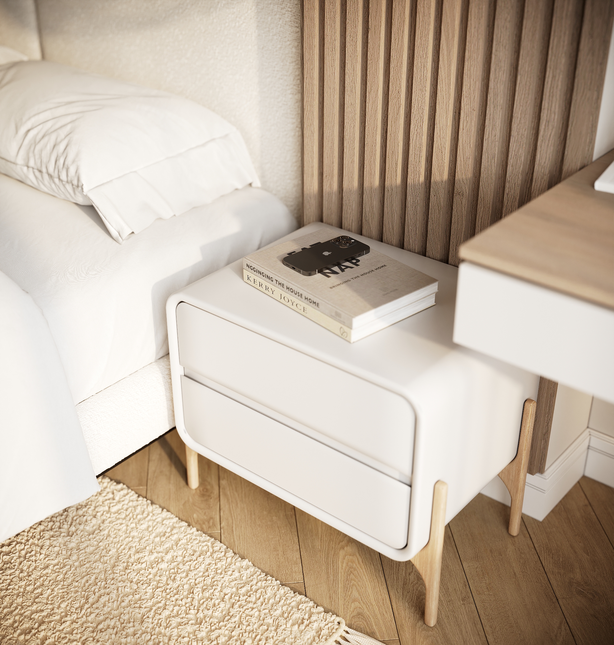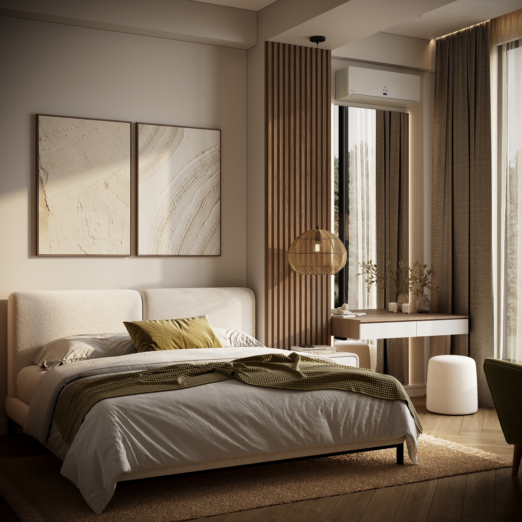 Небольшая, уютная спальня молодой девушки в закатном свете по проекту дизайнера