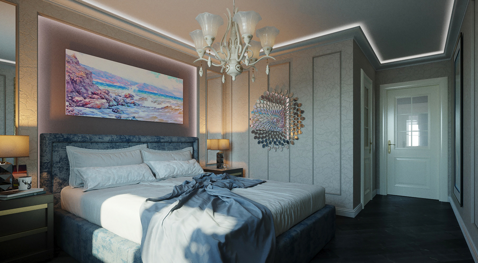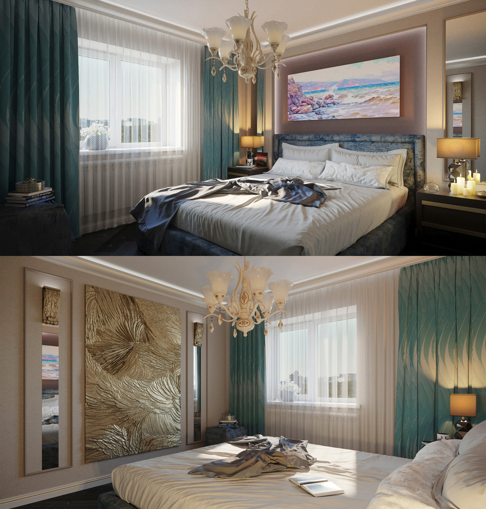Полностью поддерживаю пользователя focin1. Вообще не понимаю идею этого интерьера. Как могут сочетаться между собой все эти предметы: "легендарное" декоративное зеркало на стене, непонятным образом закрепившееся за молдинг (оно же из фрагментов состоит, а молдинг со стеной имеют разные уровни), винтажная люстра, современные лампы, картина над кроватью и оформление противоположной стены. Зачем столько декоративных приемов? На каждой стене свой.Зачем? Сочетать несочетаемое - настоящее искусство и очень тонкое мастерство. Владеть этим может не каждый. Со шторами не понятно, что случилось? Почему их так расплющило? Про шумы вообще молчу. Работы в галерее 3ddd - это определенный уровень. Нужно сопоставлять этот уровень со своим уровнем. Но за смелость - молодец.