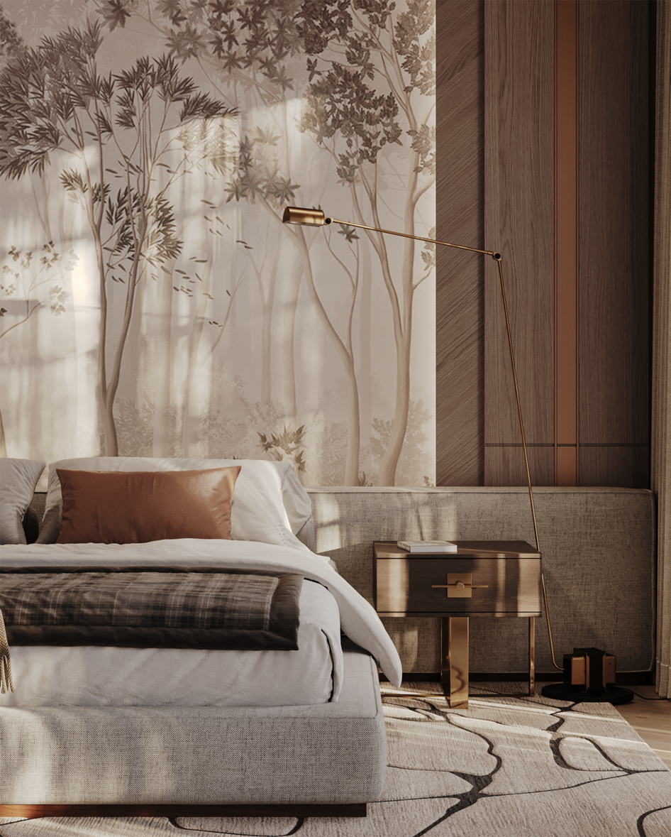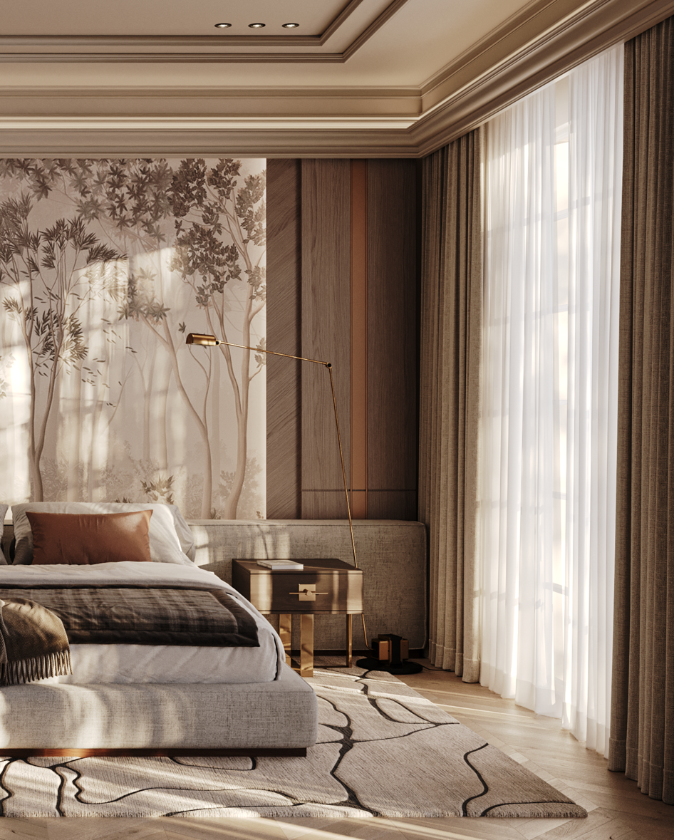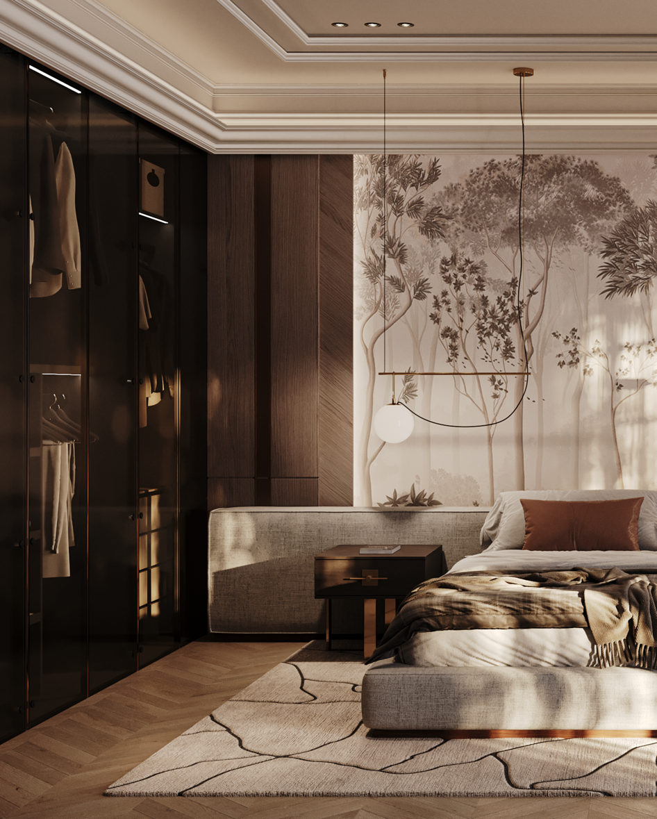 Спальня, выполненная в современном стиле — гармония тёплых оттенков, натуральных текстур и изящных деталей. ВИЗУАЛИЗАЦИЯ ДИЗАЙН: Modern ПРОГРАММЫ: 3Ds Max, Adobe Photoshop РЕНДЕР: Chaos Corona