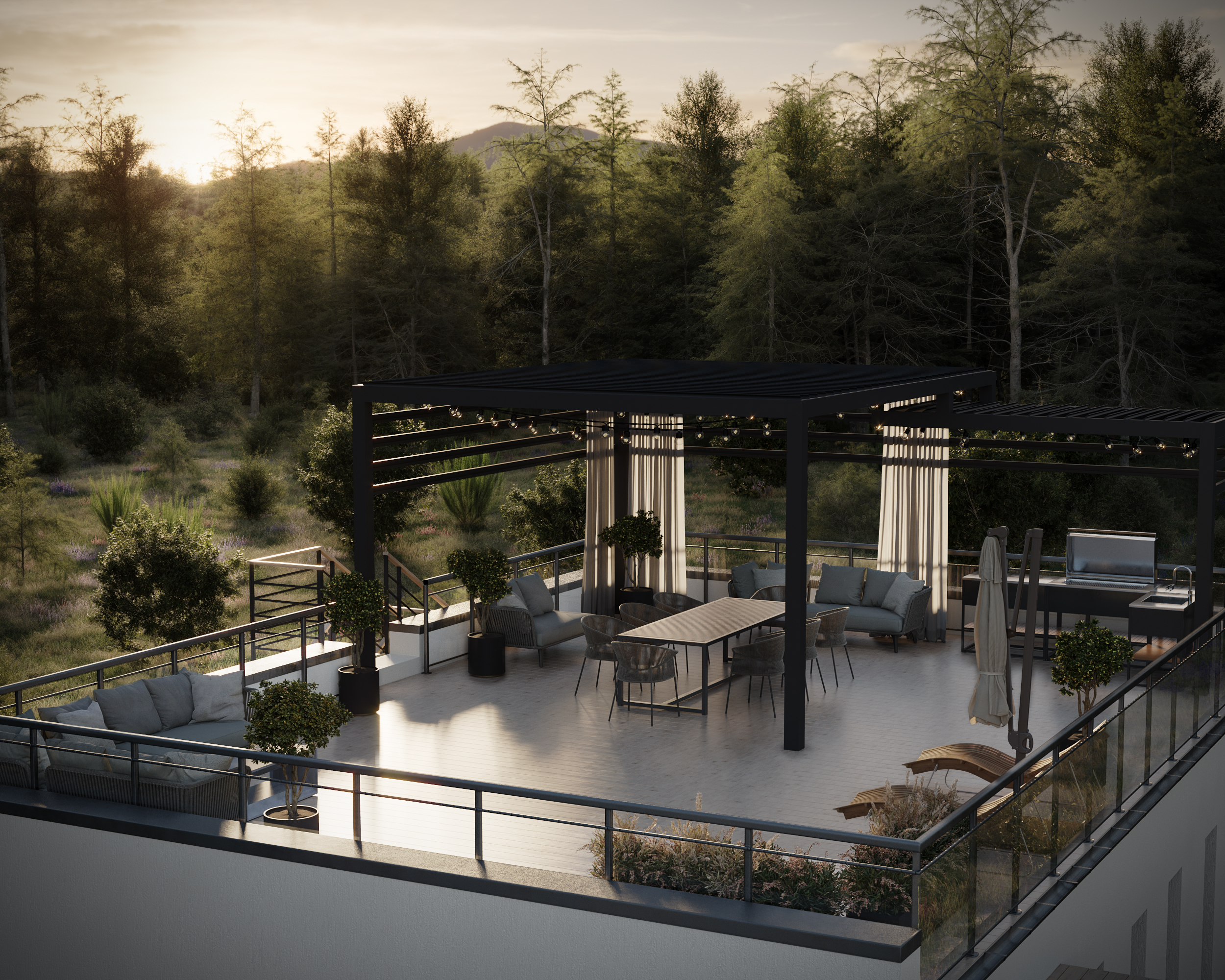 В кульминационной летней версии дом предстаёт в своей самой открытой ипостаси: с лестницей, ведущей на эксплуатируемую кровлю, что создаёт идеальную картину для жизни на свежем воздухе.