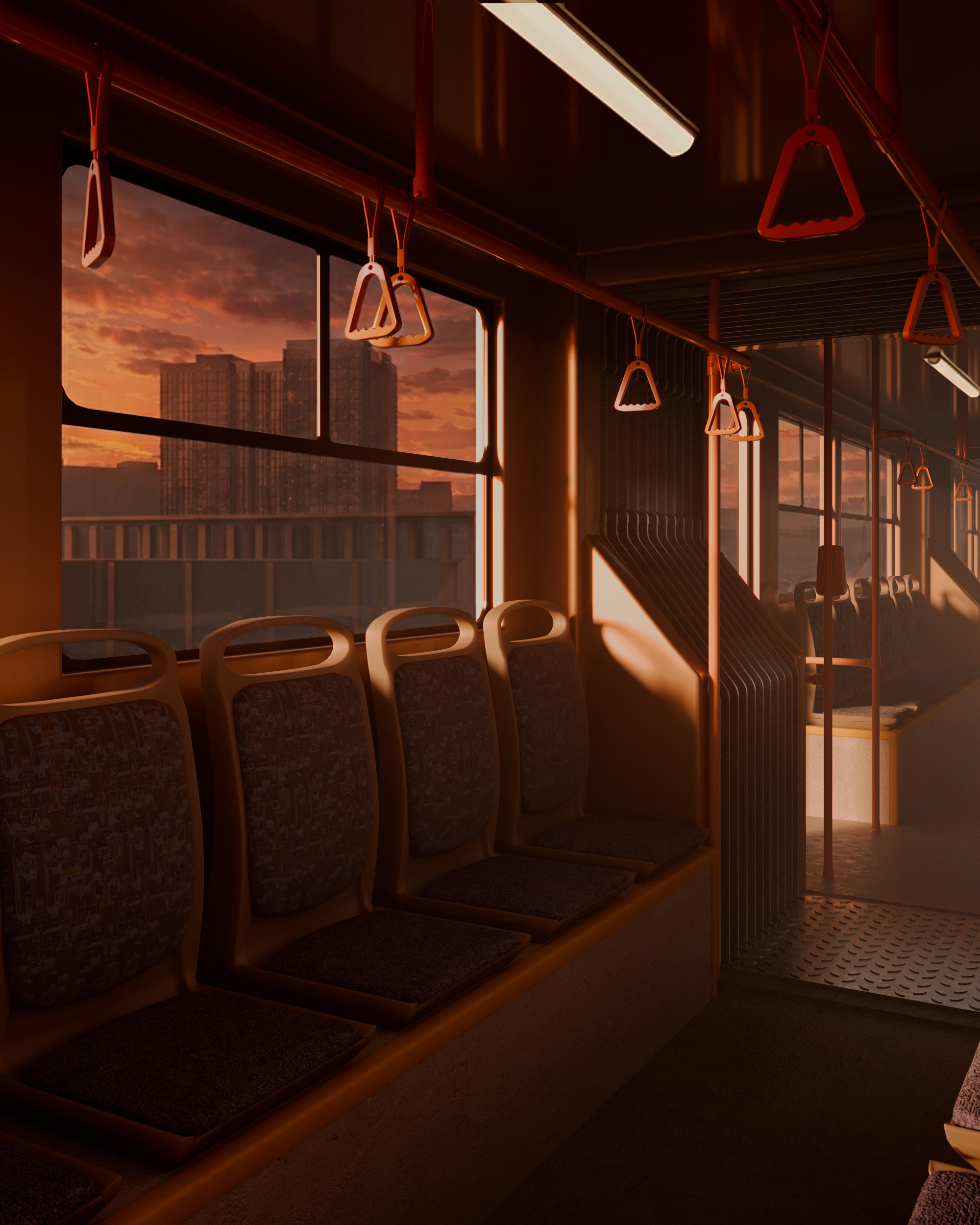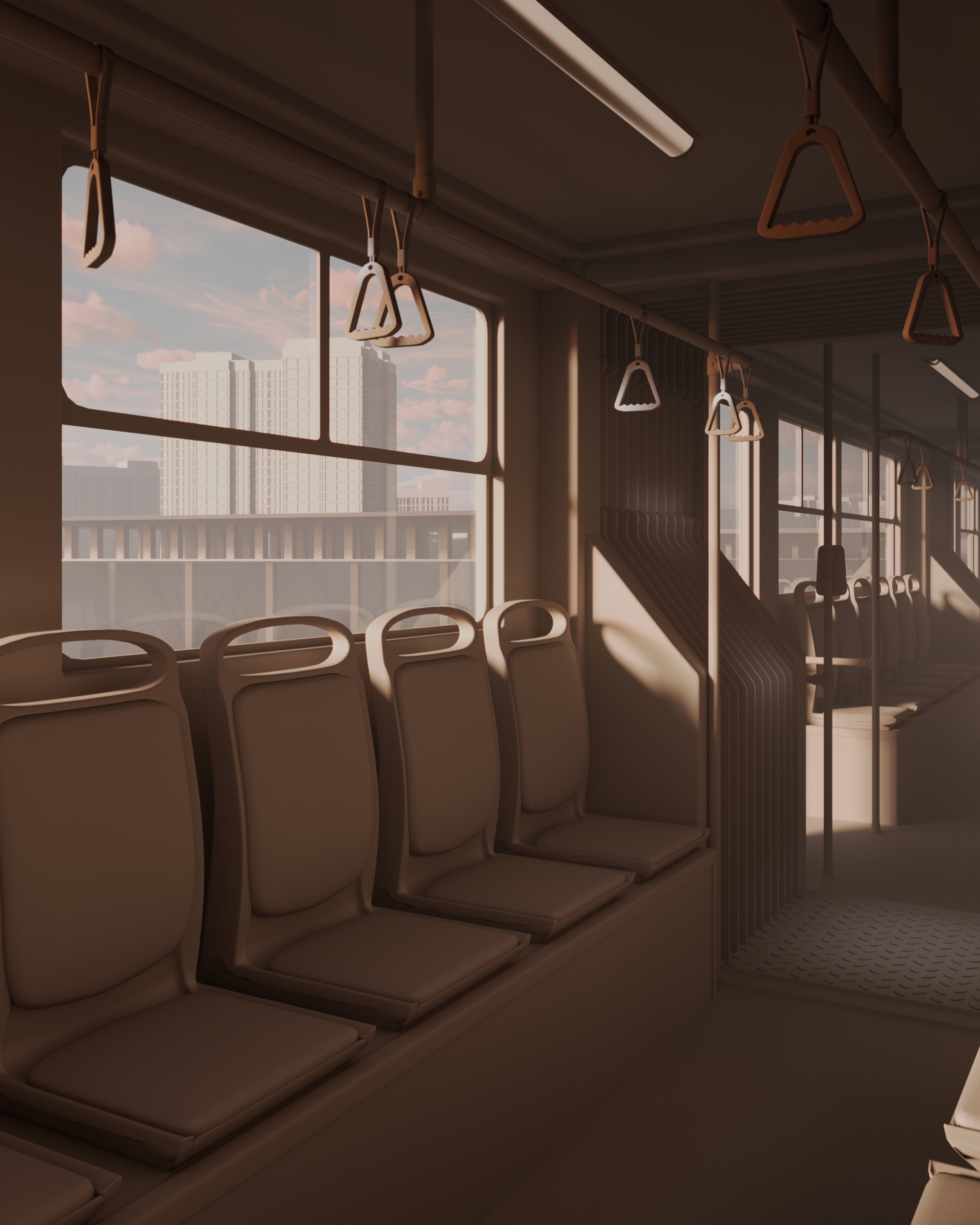 The render was made based on a picture from Pinterest. It tries to capture the calmness of an empty train during a sunset ride.