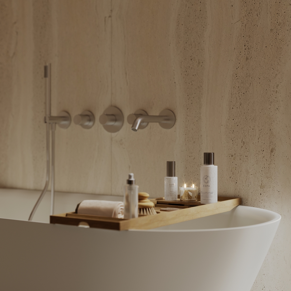 Очень красиво,Очень умно планировка.СОвременно. Качество рендера.Также умное решение кранам -нержавейка.И цвет подходит и уход минимально. Но света мало-нужно больше светильников.Хороший потенциал у материала. Травертин в СССР использовали в отделке стен различных проектных организаций , бань, и других общественных интерьеров. Но если это керамогранит-то выгладит отлично. Возможно это и микроцемент без швов-что ещё лучше потому-что дешевле и быстрее.