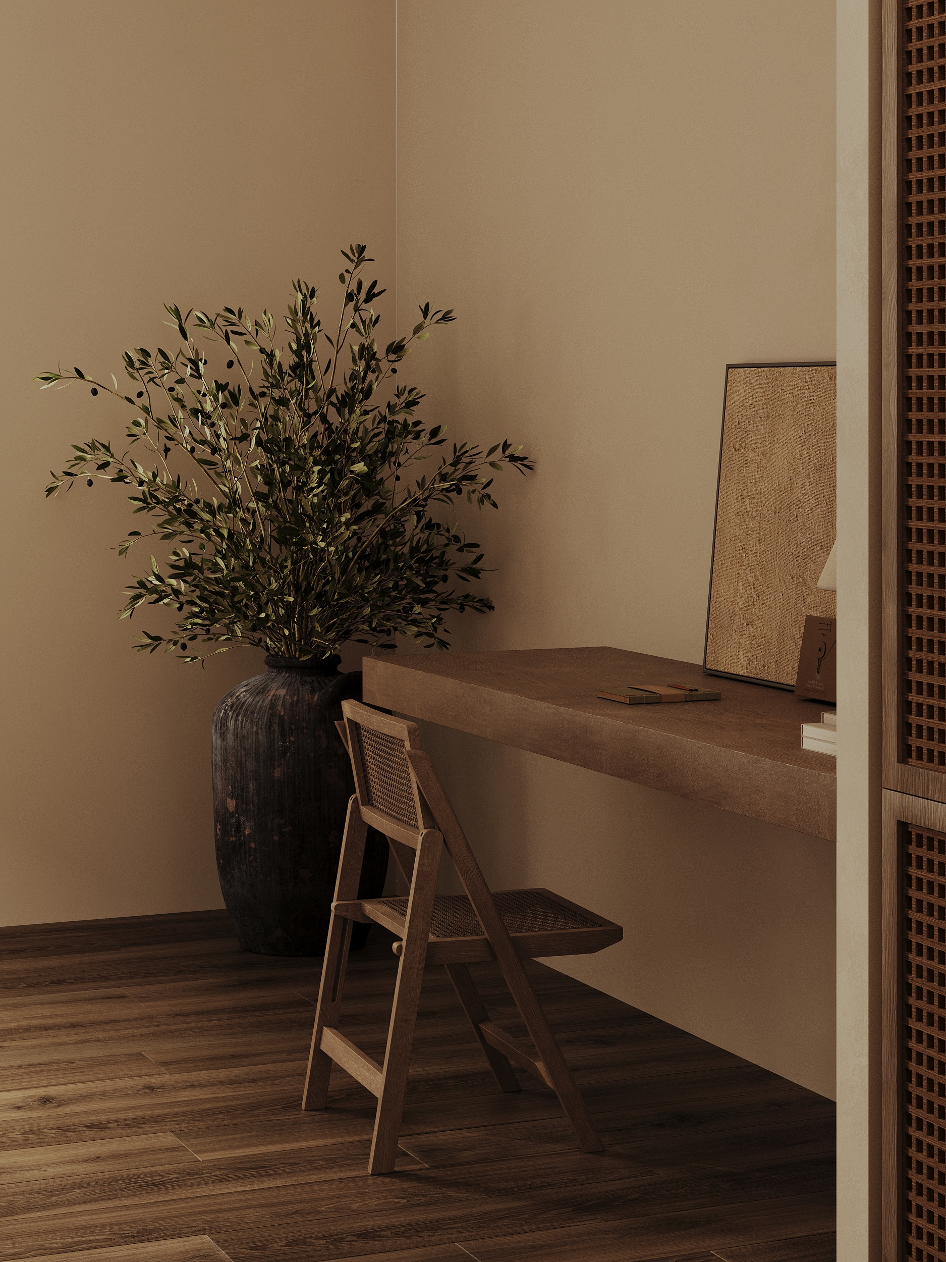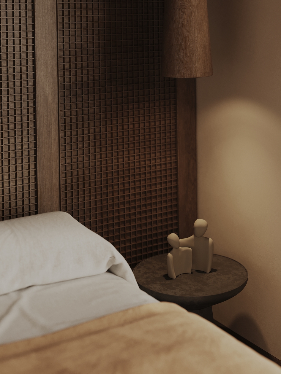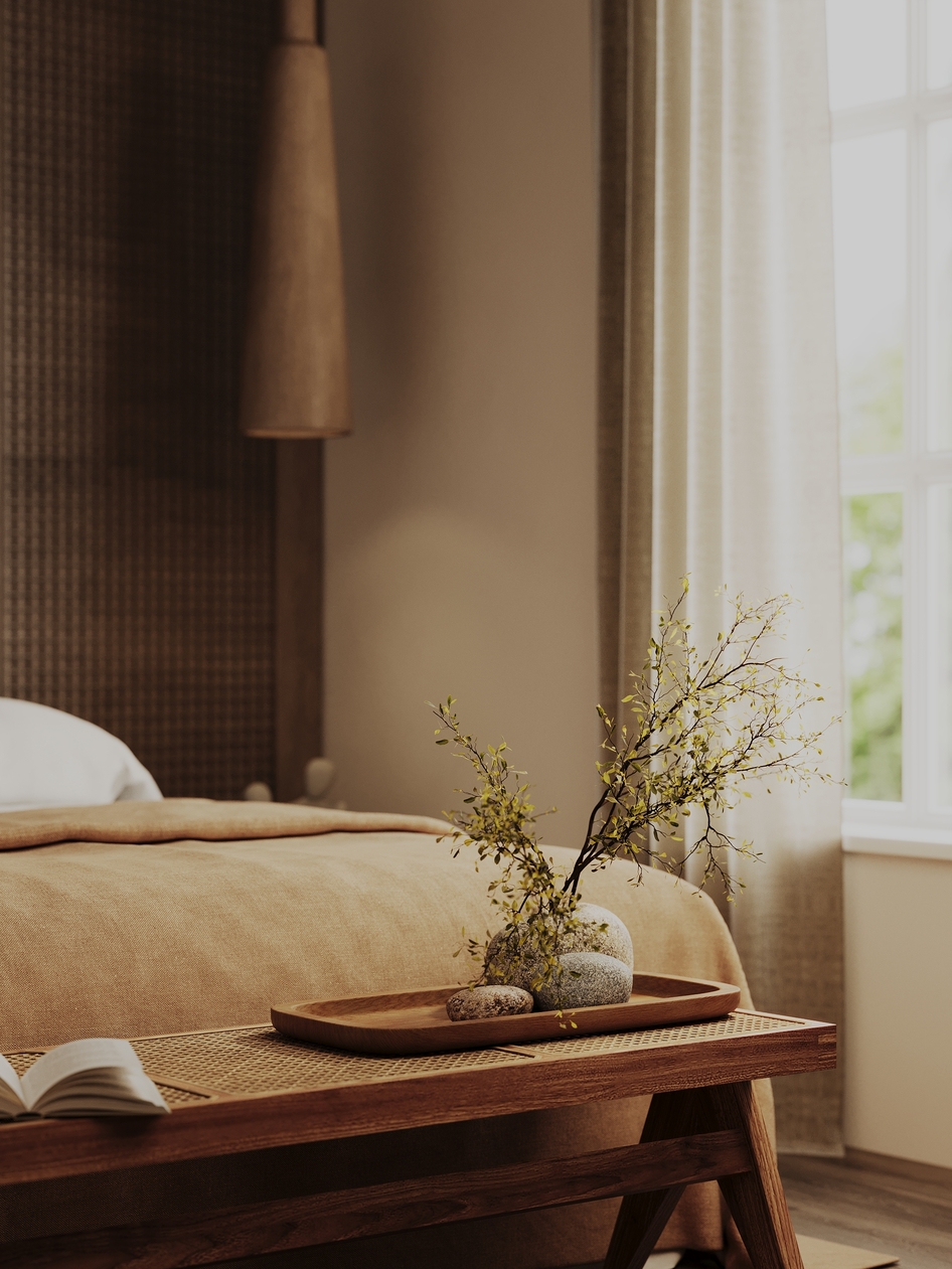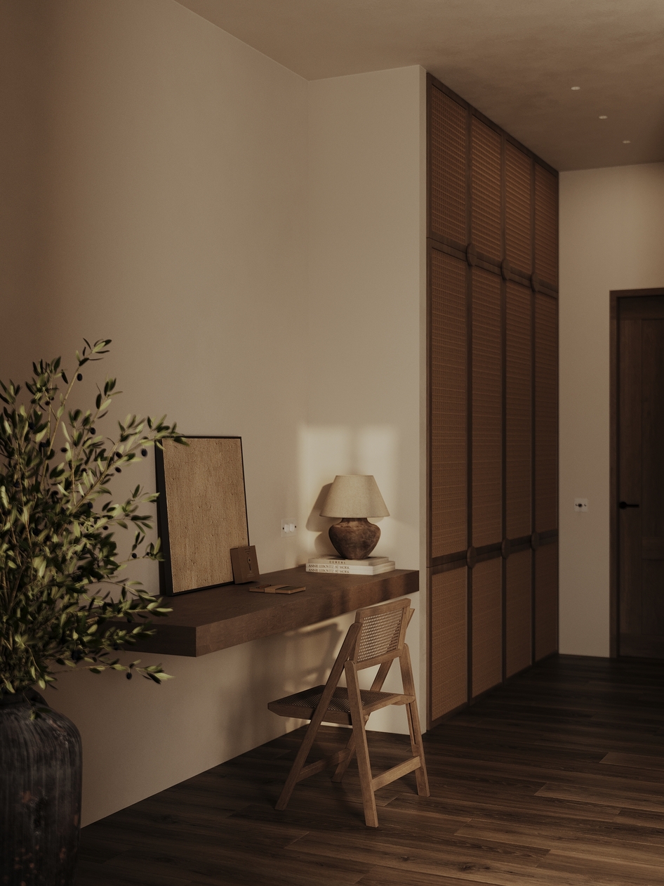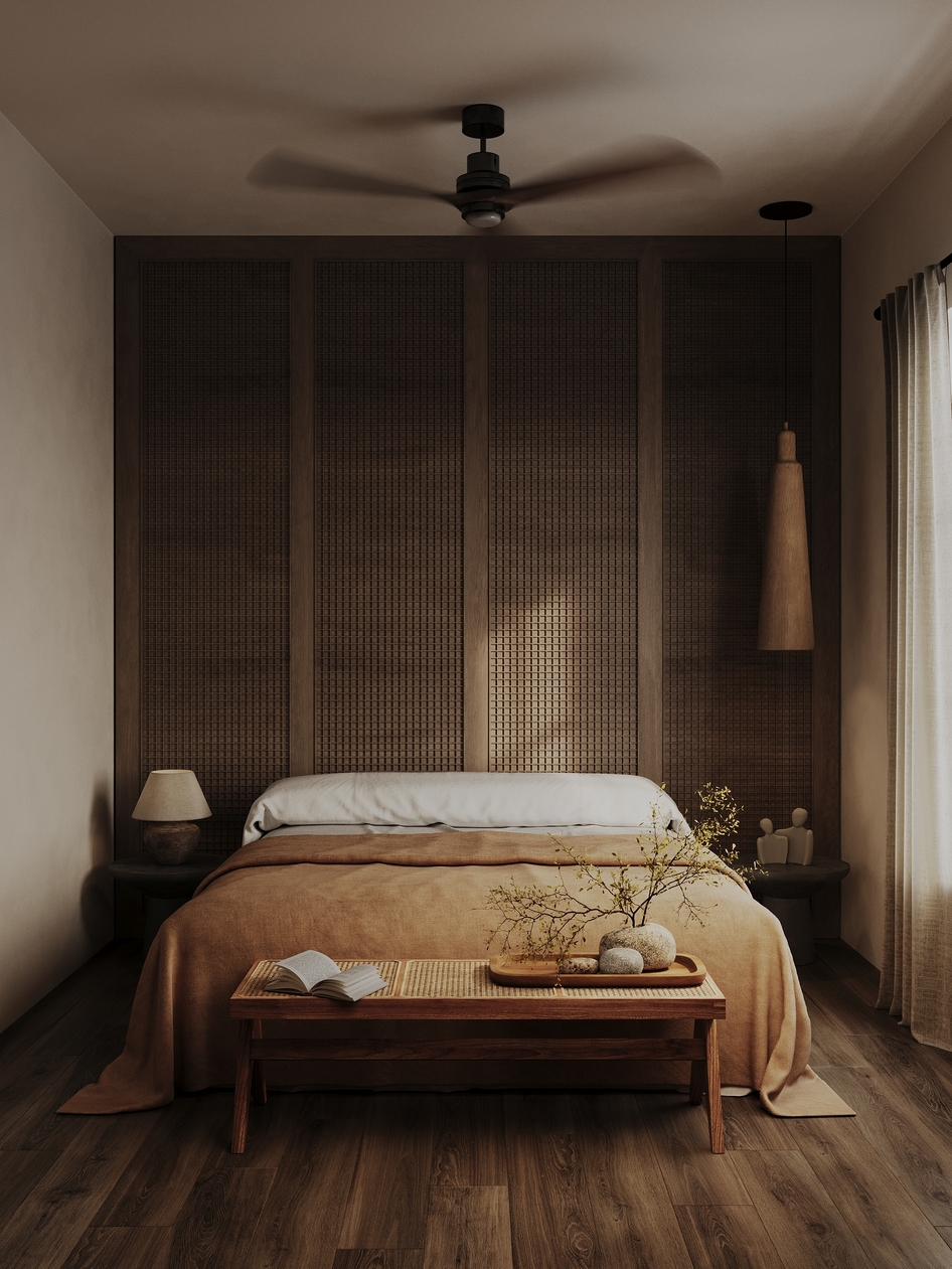 Японская спальня В этом дизайне мастерски сочетаются чистые, лаконичные линии минималистского стиля с несовершенной текстурной красотой ваби-Саби, воплощая принципы Japandi - слияния японской и скандинавской эстетики.
