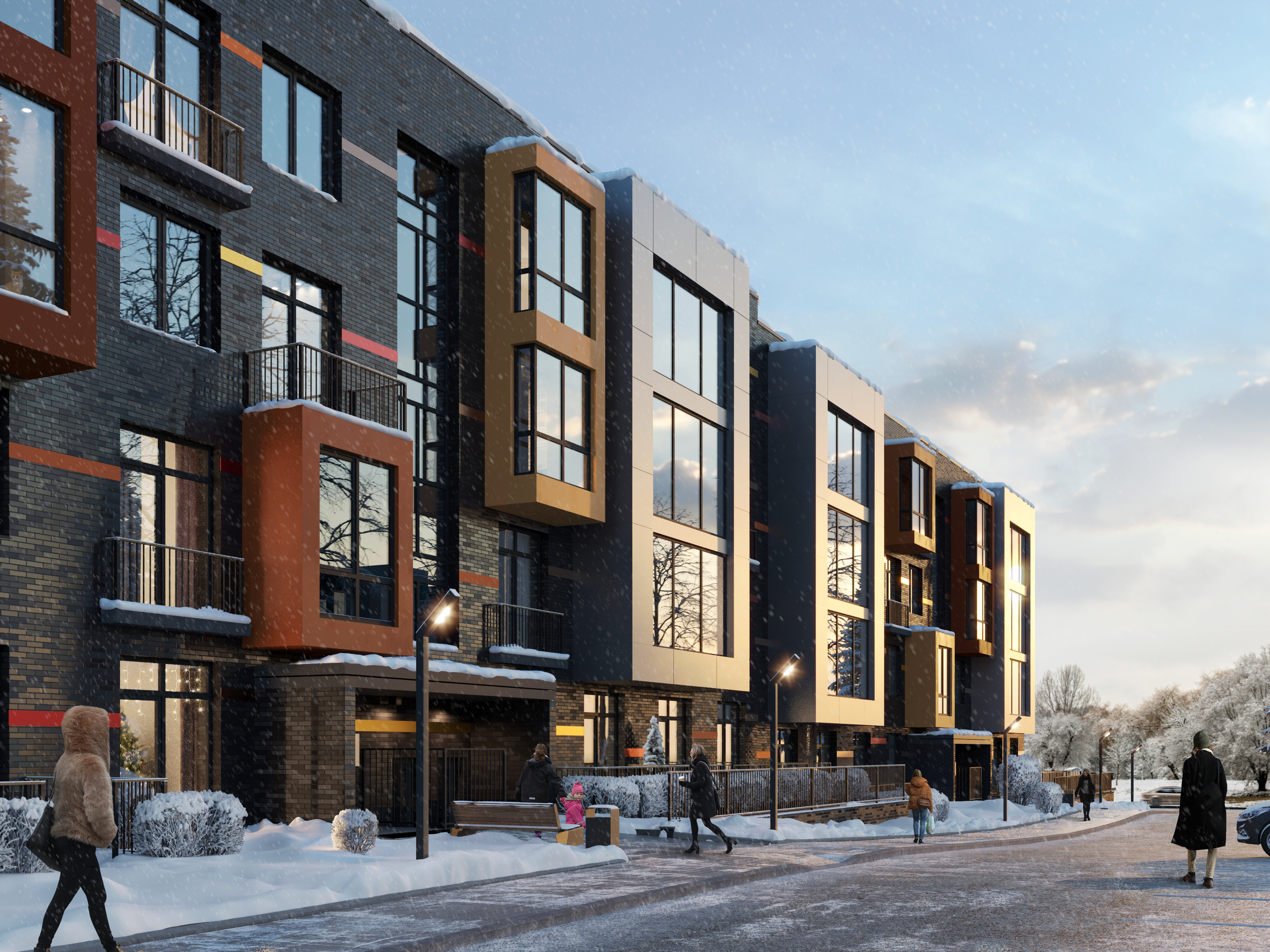 В этой зимней визуализации жилого комплекса царит волшебная атмосфера спокойствия и уюта. Снег мягко покрывает каждую поверхность, создавая ощущение сказочного белоснежного одеяла, которое нежно обнимает дома и окружающую природу. Легкое солнечное сияние пробивается сквозь мутное небо, придавая сцене особую таинственность и мягкое тепло, словно природа сама наполняет этот уголок светом и надеждой. В этом зимнем пейзаже сочетается гармония природы и современного комфорта — место, где каждый день наполняется особым очарованием и спокойствием, приглашая к уюту и размышлениям. ЖК Спектр. Новосибирск